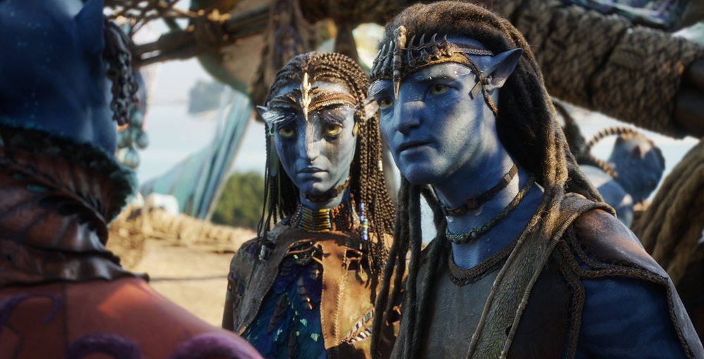 Events only get increasingly frenetic and crazy from there, as Jake, Neytiri, and their children bounce back and forth across Pandora trying to avoid Varang, Quaritch, and everyone else that human colonial military leader General Ardmore (Edie Falco) sends their way. Marine biologist Dr. Garvin (Jemaine Clement) plays a key role in all this chaos, as does cutthroat Tulkun whaler Captain Mick Scoresby (Brendan Cowell). Corporate stooge Parker Selfridge (Giovanni Ribisi) is also once again on hand, lusting to loot as many of Pandora’s rich natural resources as he can, while Metkayina clan leaders Tonowari (Cliff Curtis) and his extremely pregnant wife Ronal (Kate Winslet) again find themselves and their people as the last line of defense against the Sky People’s worst machinations.